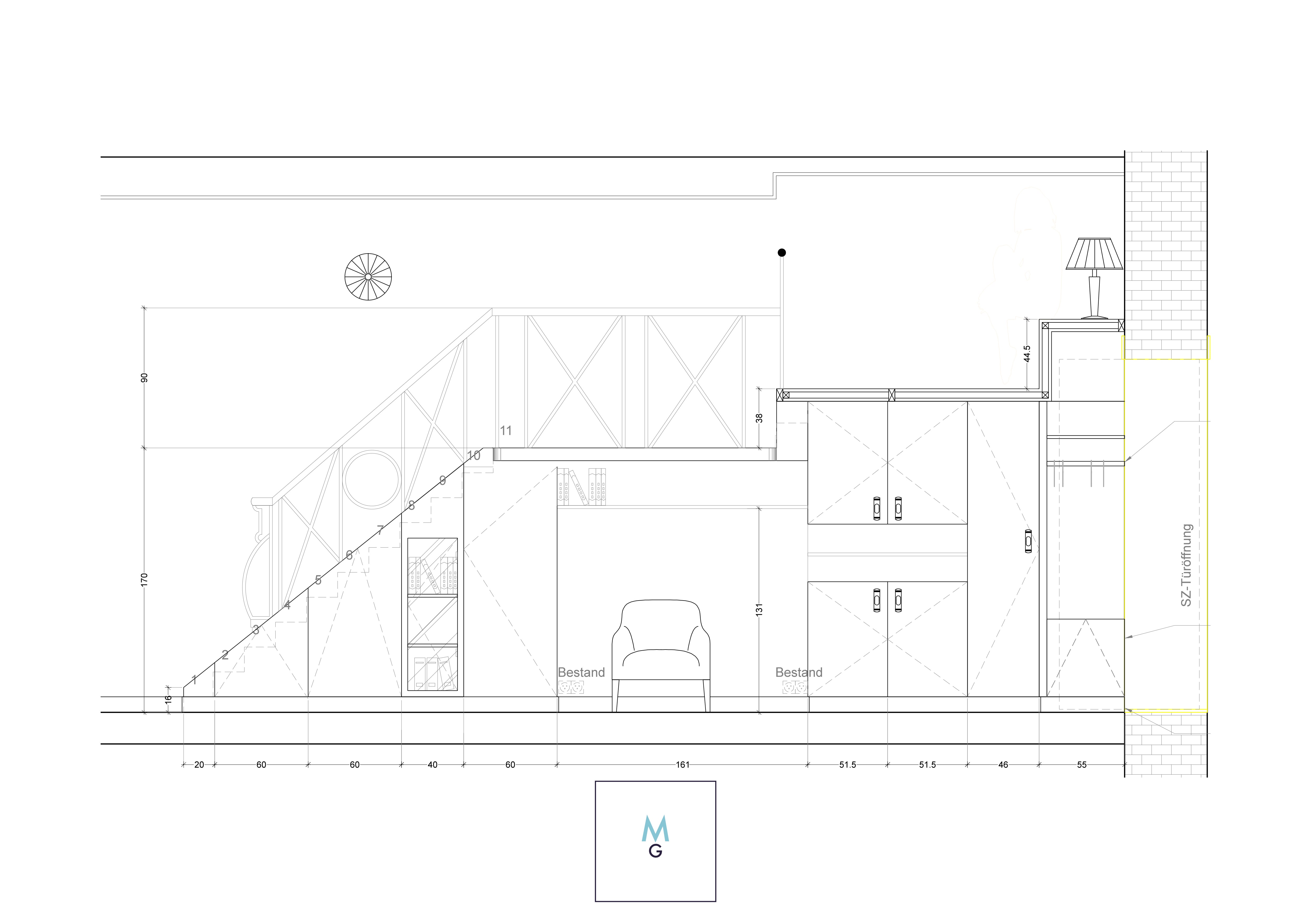 The mezzanine designed in the Berliner Zimmer not only brings a new flair to the room, the wood elements and the duck blue and small hollow brass handles give the room its Jugendstil charm back.