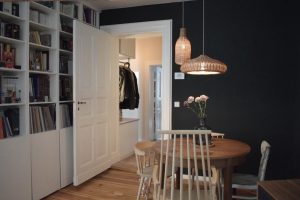 -This sweet apartment located in a quiet “Hinterhof” far from the traffic of the City is a little ‘Oase’ for a family of four. The electricity system dating from the GDR-time was still in aluminium so all the systems has to be redone and with this all the walls and rooms were touched. We played with the textures and the colors of the surfaces such as bricks, deep greens, terracota tile colors or pastel blue… We developed this colorful sweet palette through discussions with the clients, affirming their universe while confirming the wish of making the ‘Altbau’-feeling more present.
