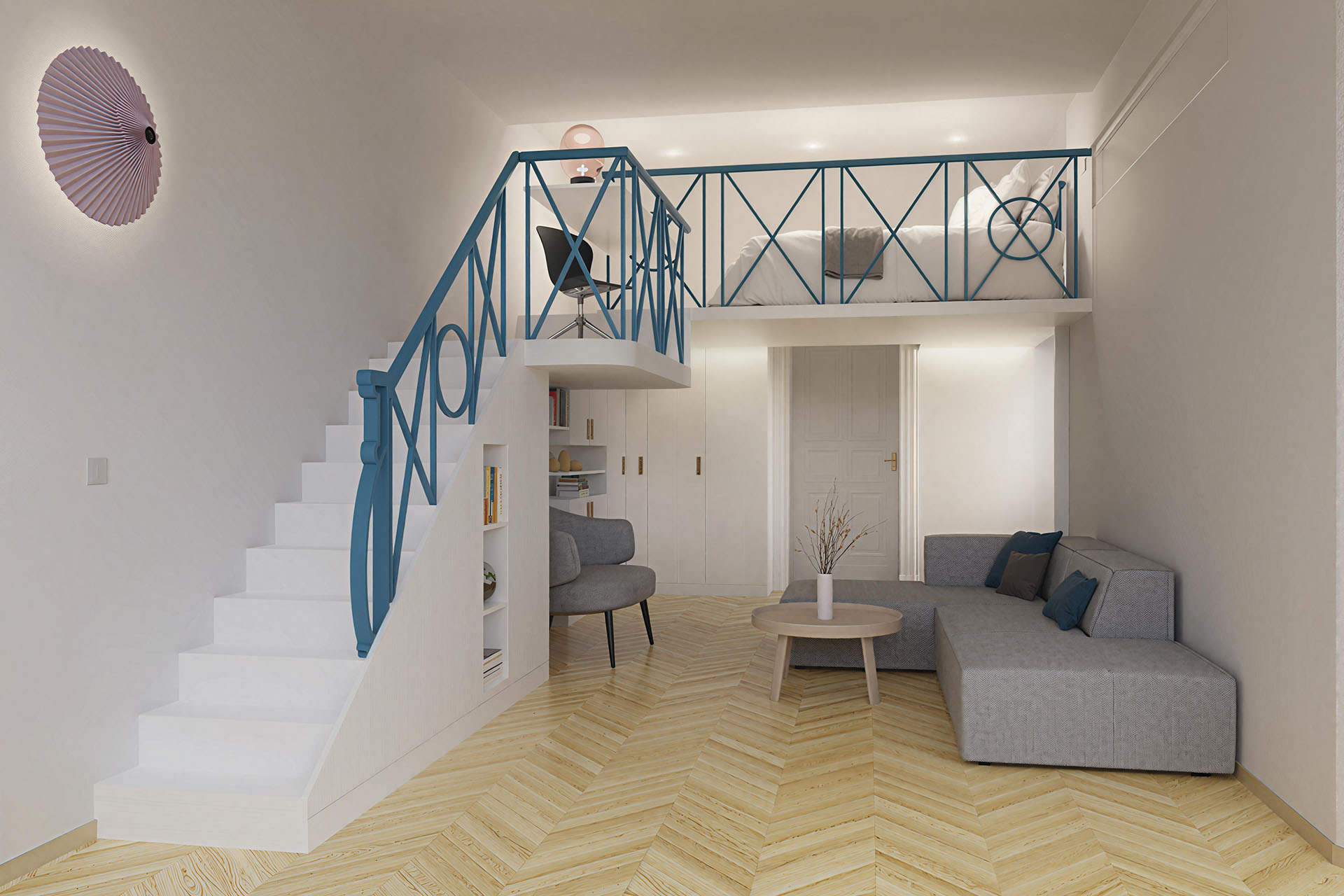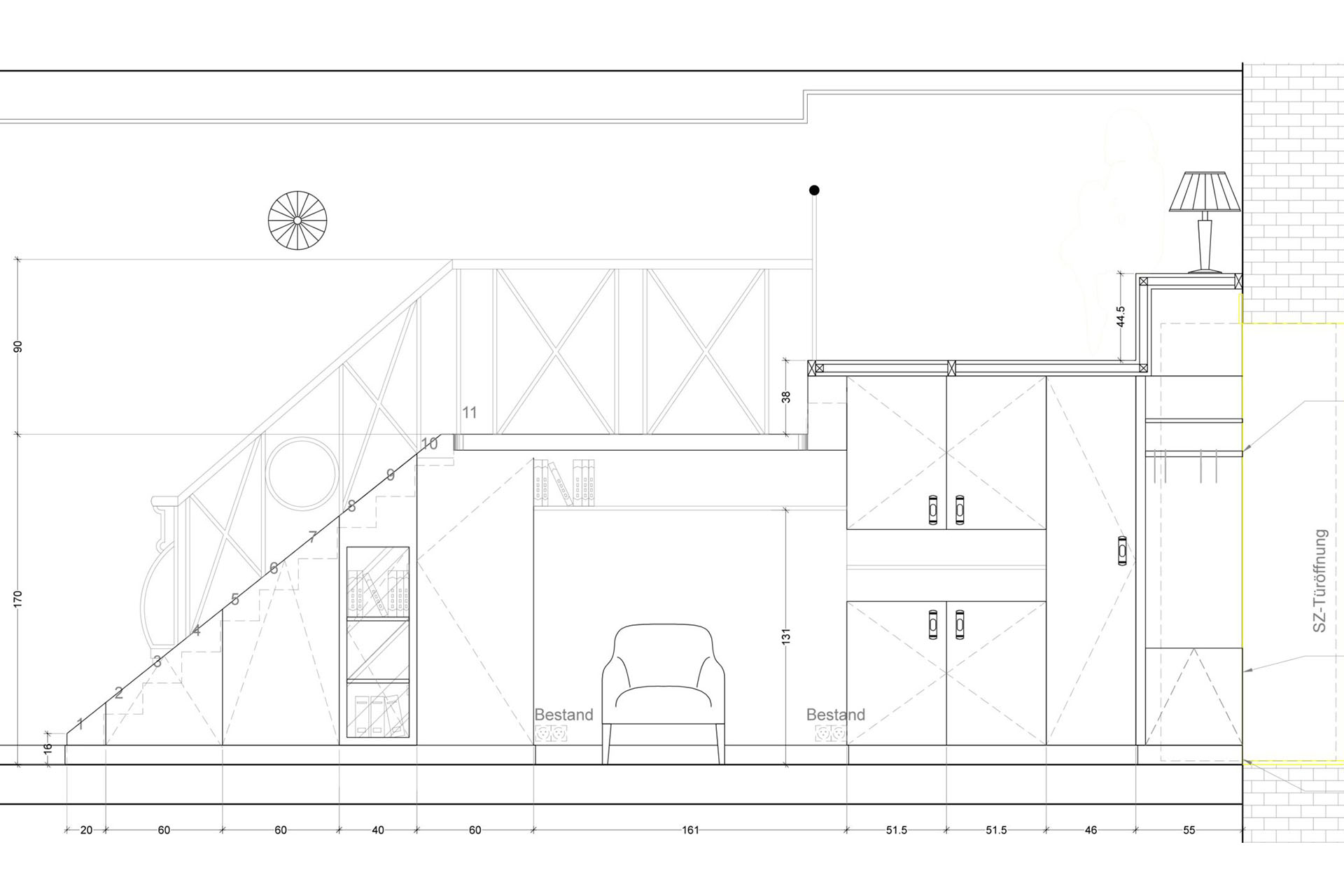 Custom-designed mezzanine for a Berliner Zimmer: carved wood, teal blue and brass details bring timeless character.