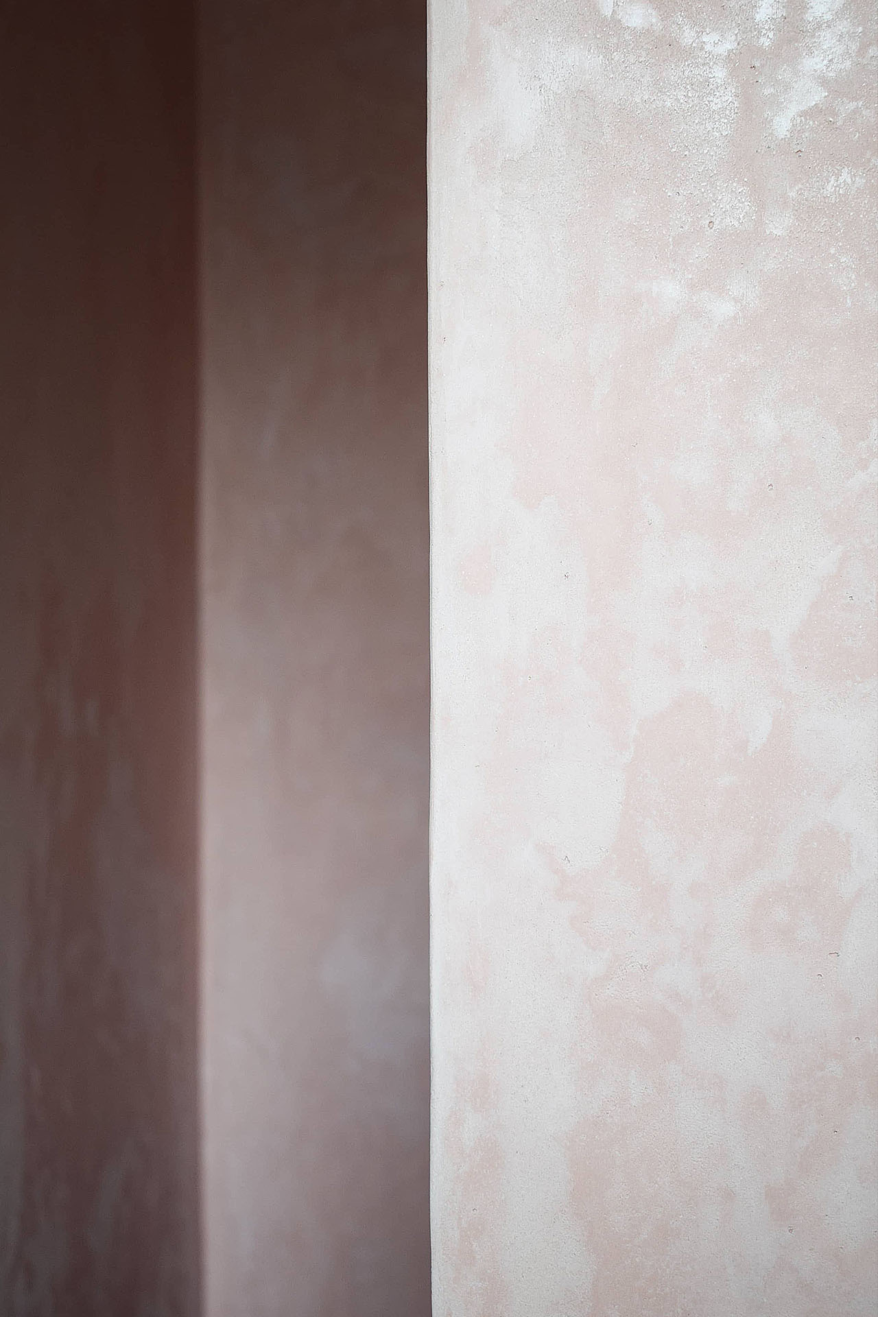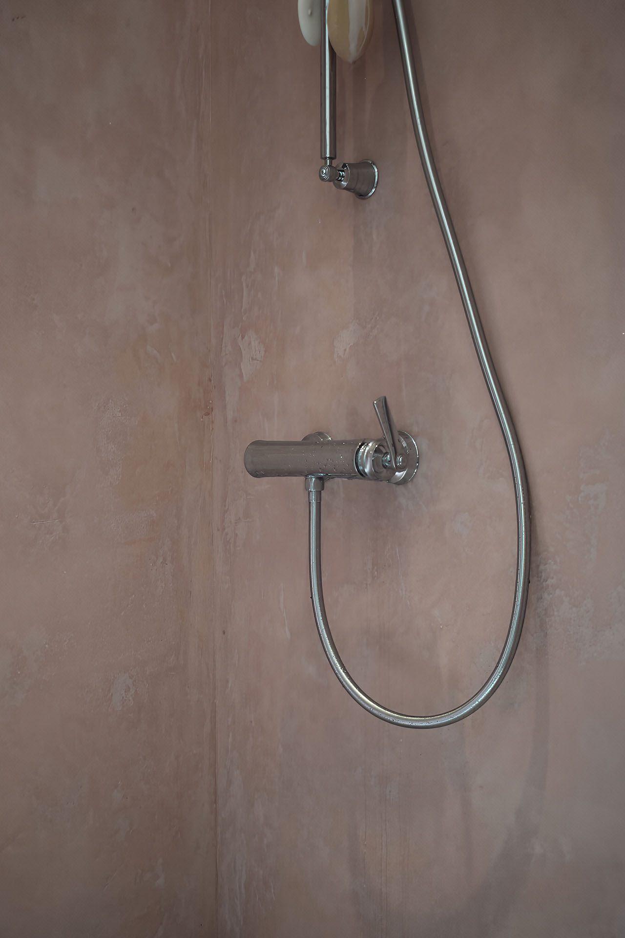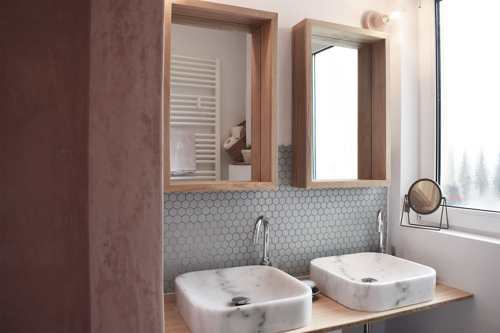 Renovated family bathroom with a rosy lime-plaster shower, bamboo and pastel-blue mosaics for a soft, enveloping ambience. Focus on materials, objects and gentle spatial qualities for a pleasant sense of well-being.
