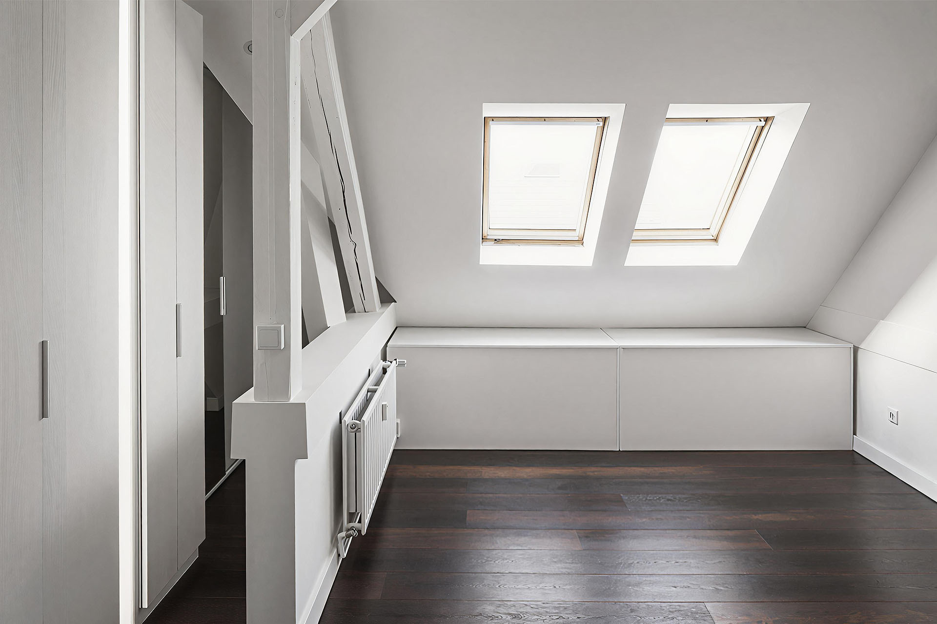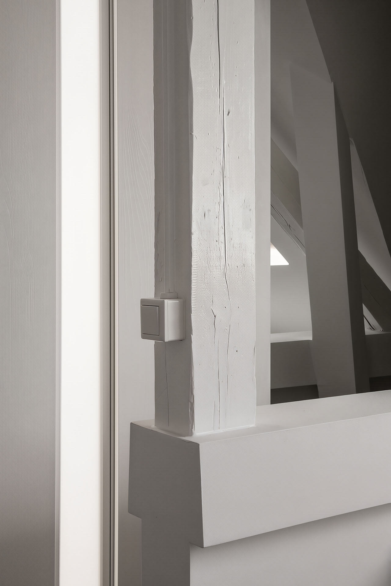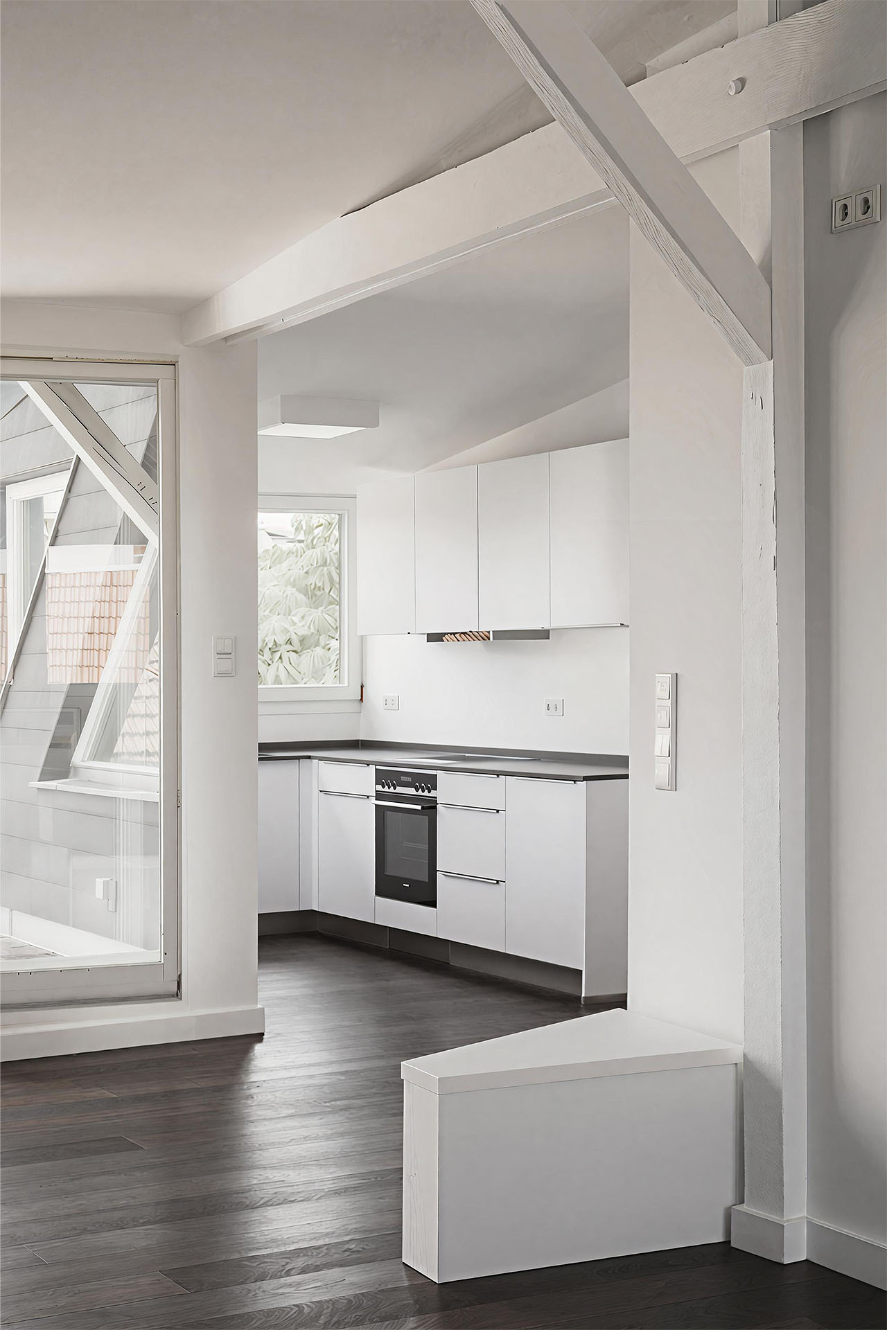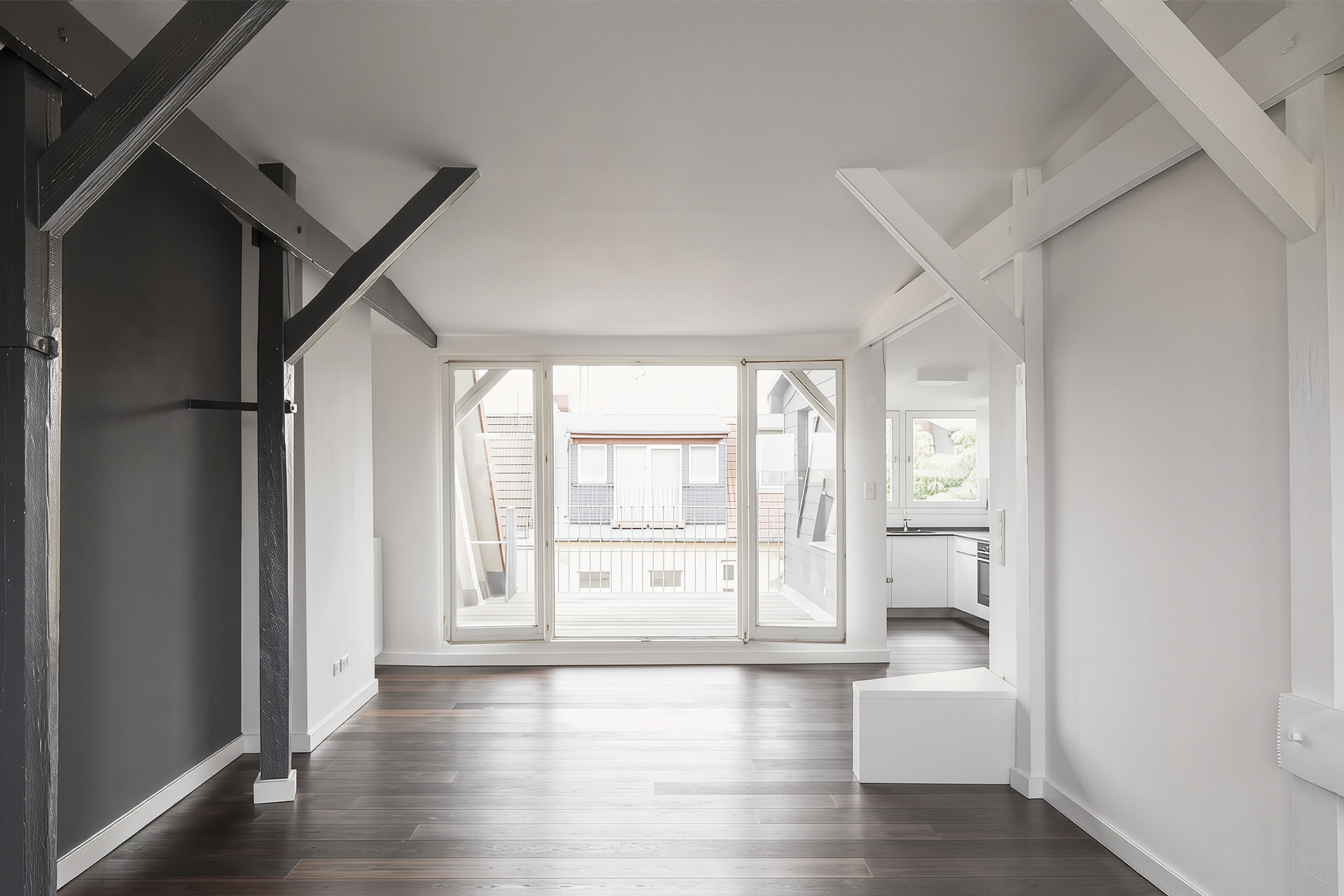 A cosy attic apartment in Berlin-Neukölln, where anthracite and white tones expand and calm the space.