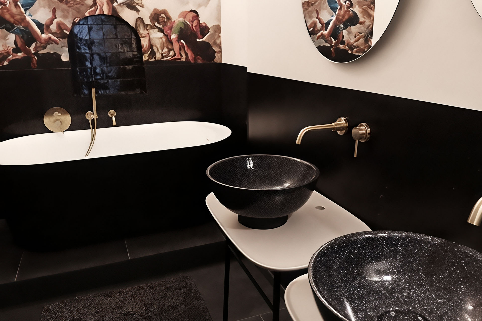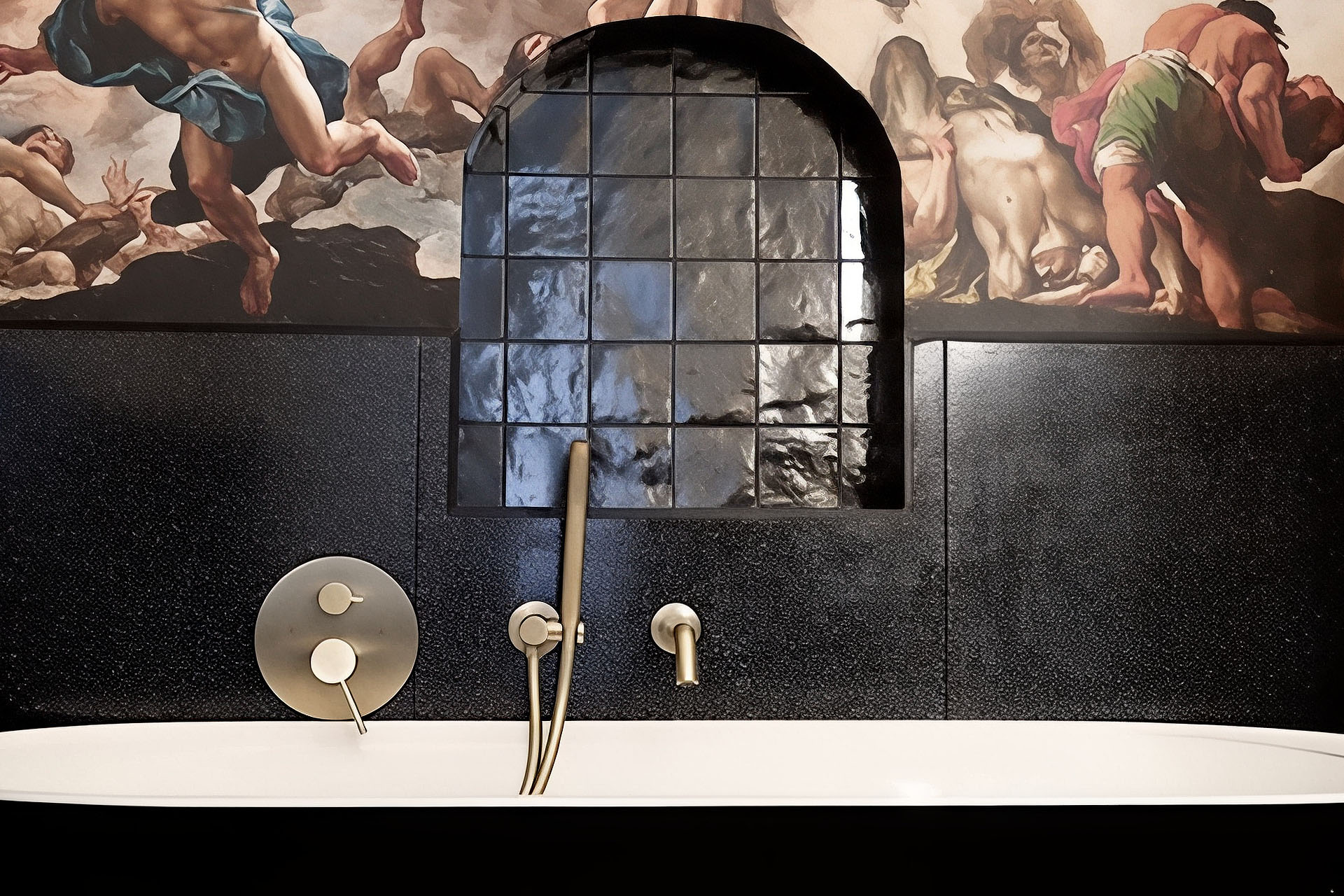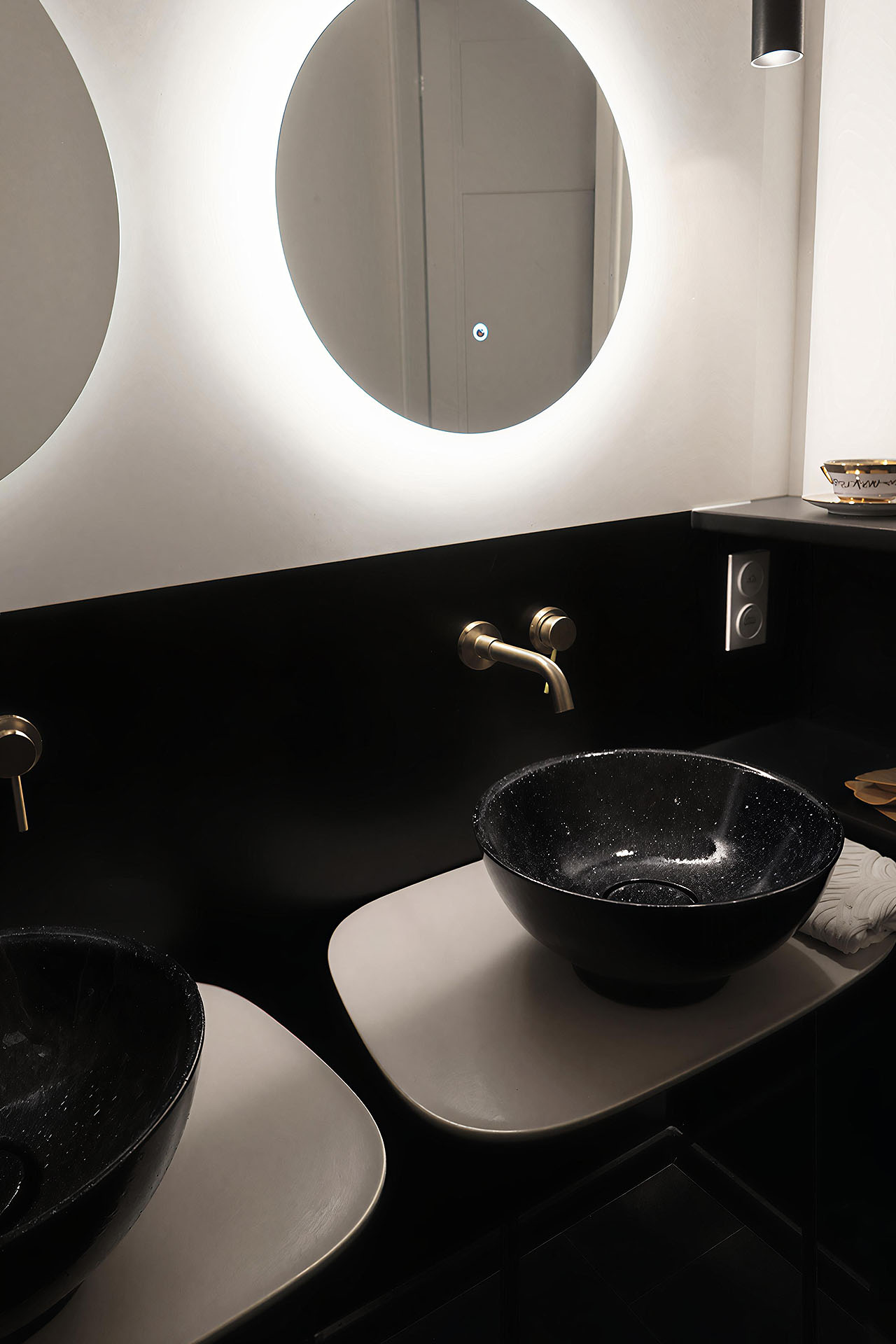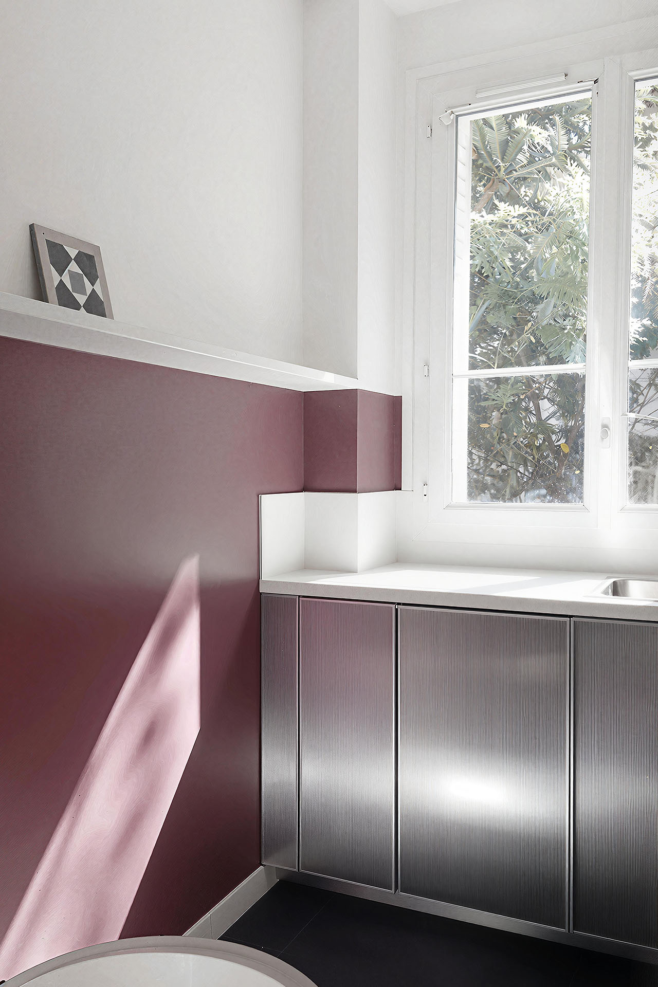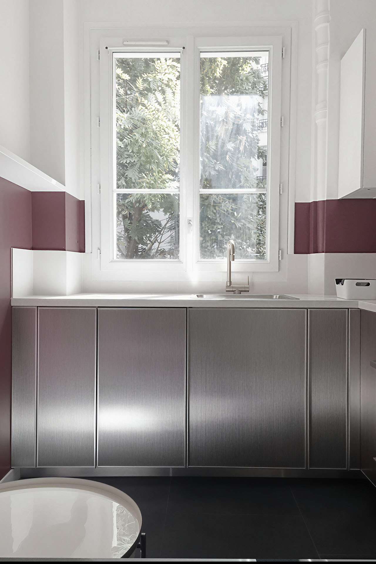 Transformed Paris pied-à-terre: bright kitchen, warm wall tones and metallic fronts create a vibrant feel. The bathroom features a theatrical decorative mural and elegant black wood-composite basins.