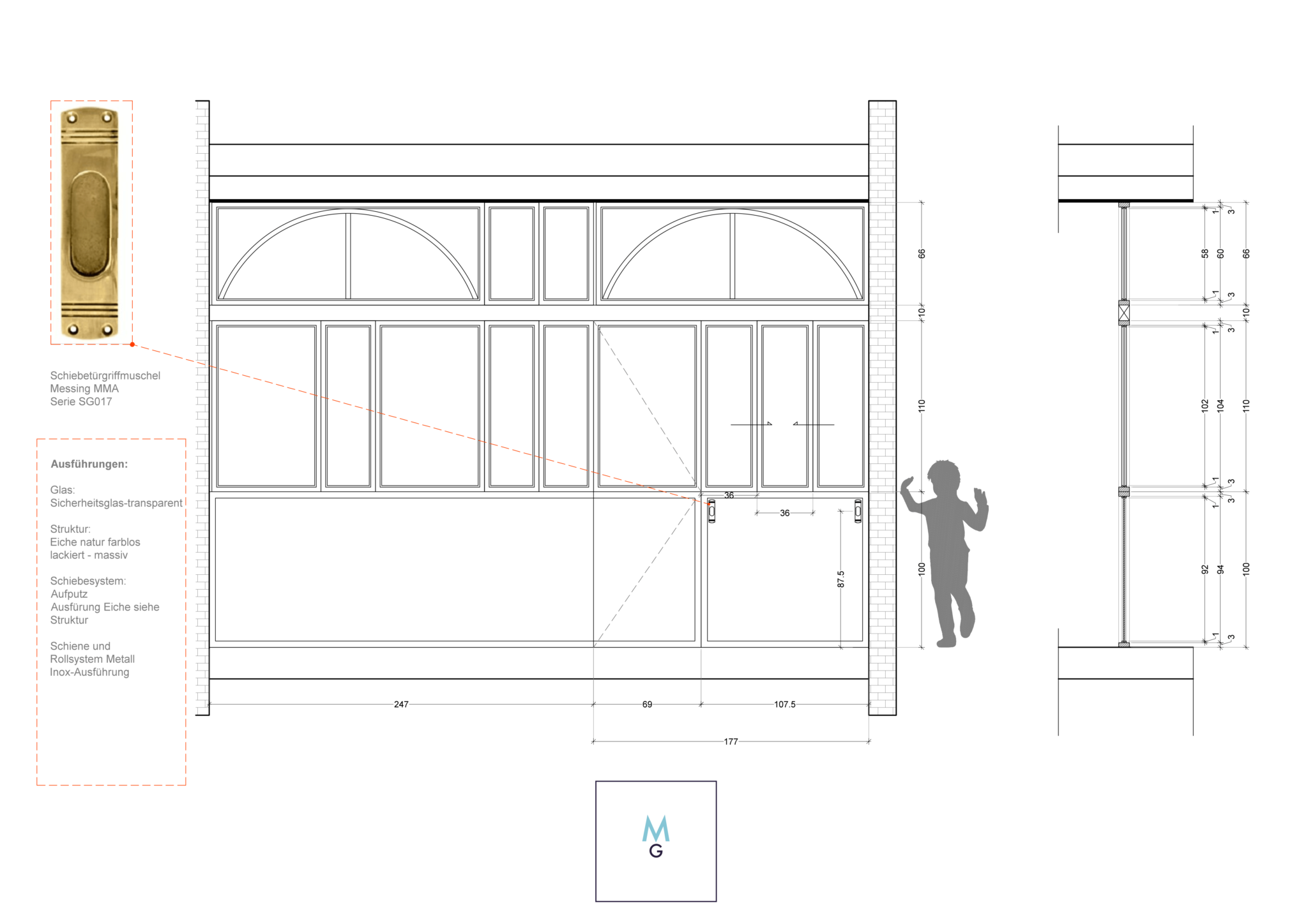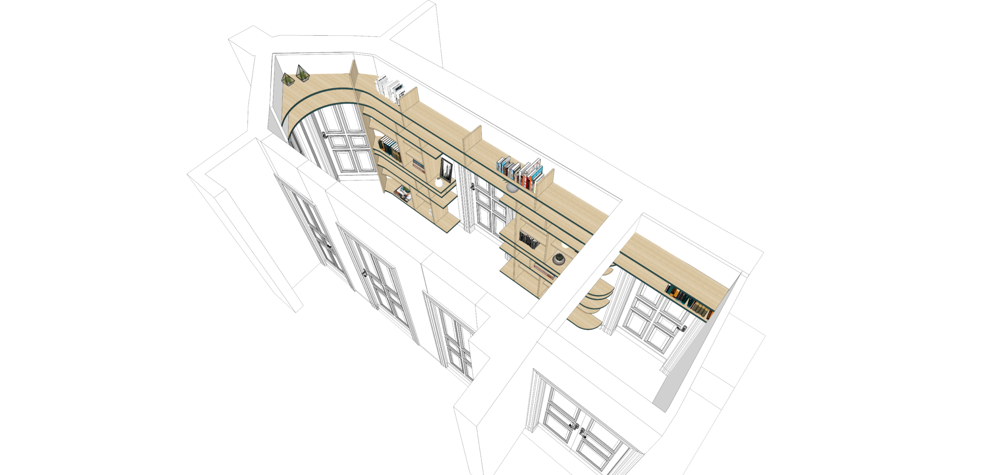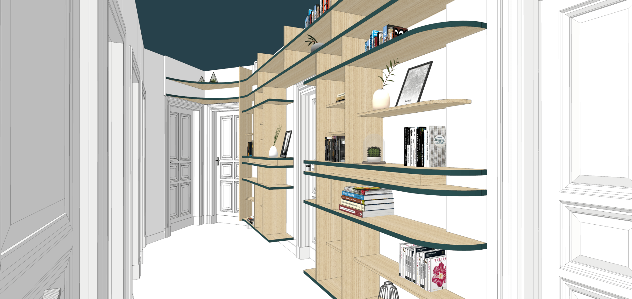 Reorganized entrance framed by historic doors, with a custom bookshelf, soft curves and blue accents. A light wood panel separates the master suite from the living room and highlights the arched windows with solid wood.