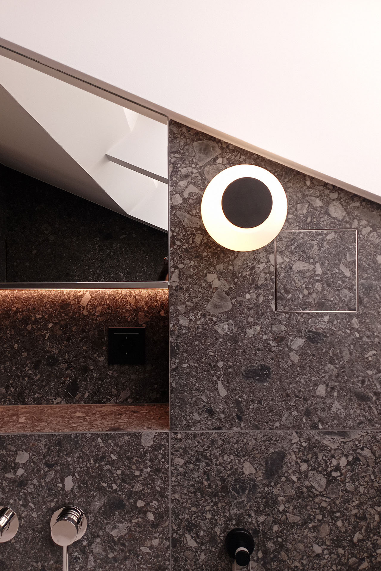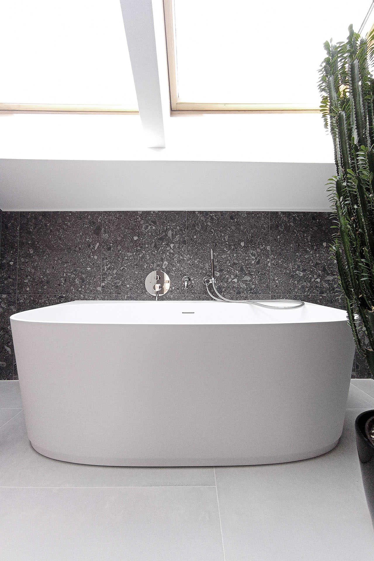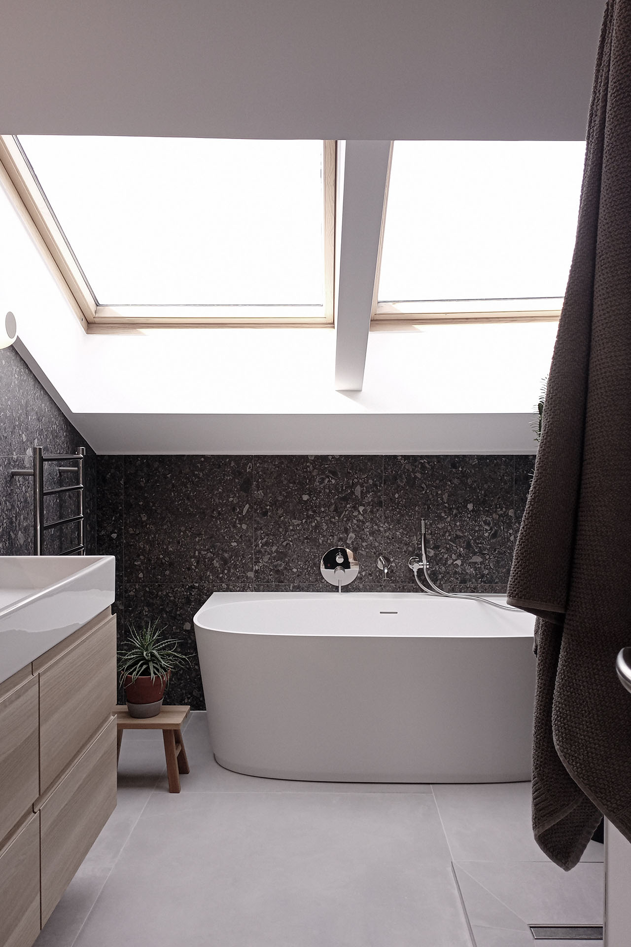 Attic bathroom with a soft, bright atmosphere and darker accents for a boutique-hotel feel. Concept and detailed planning.