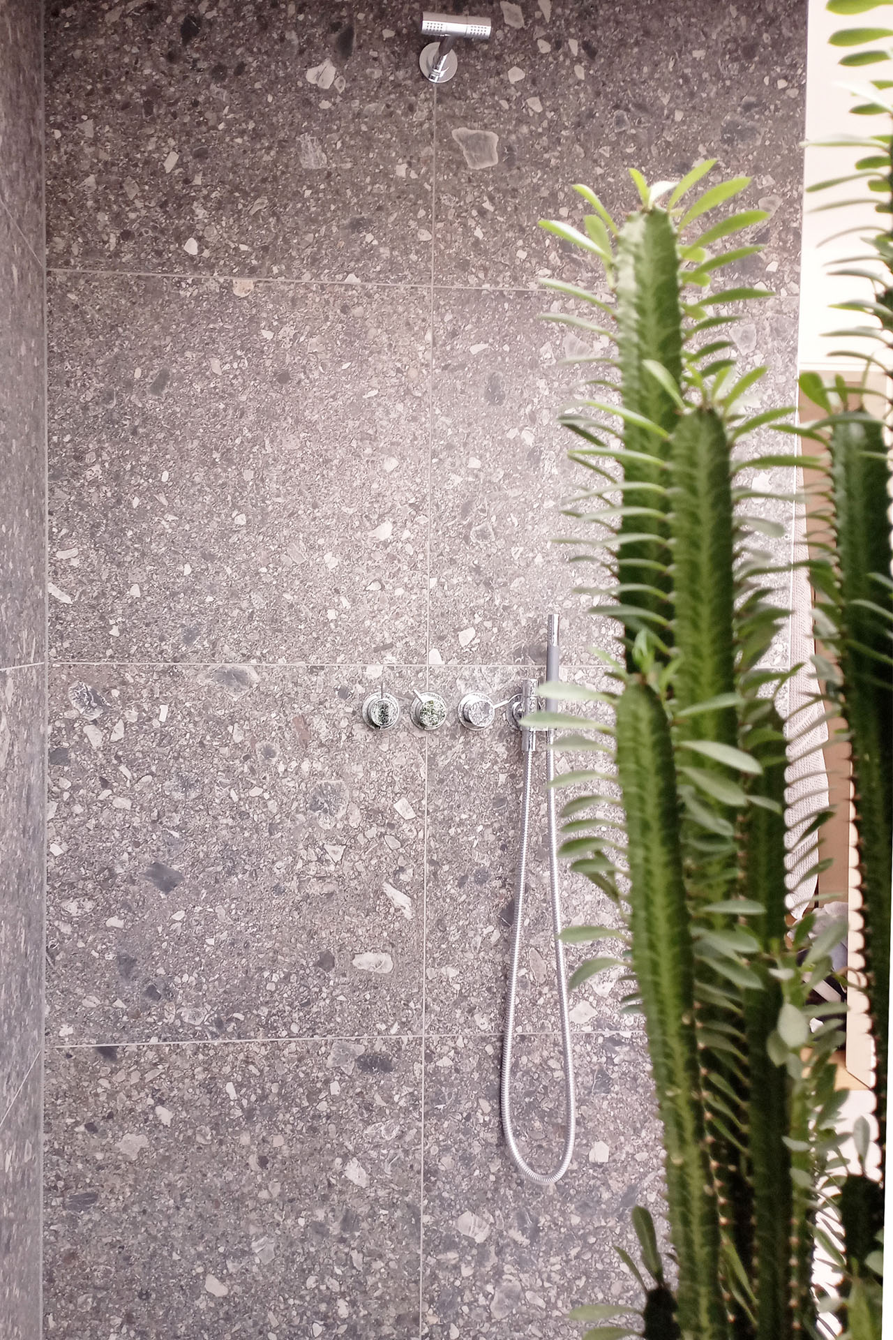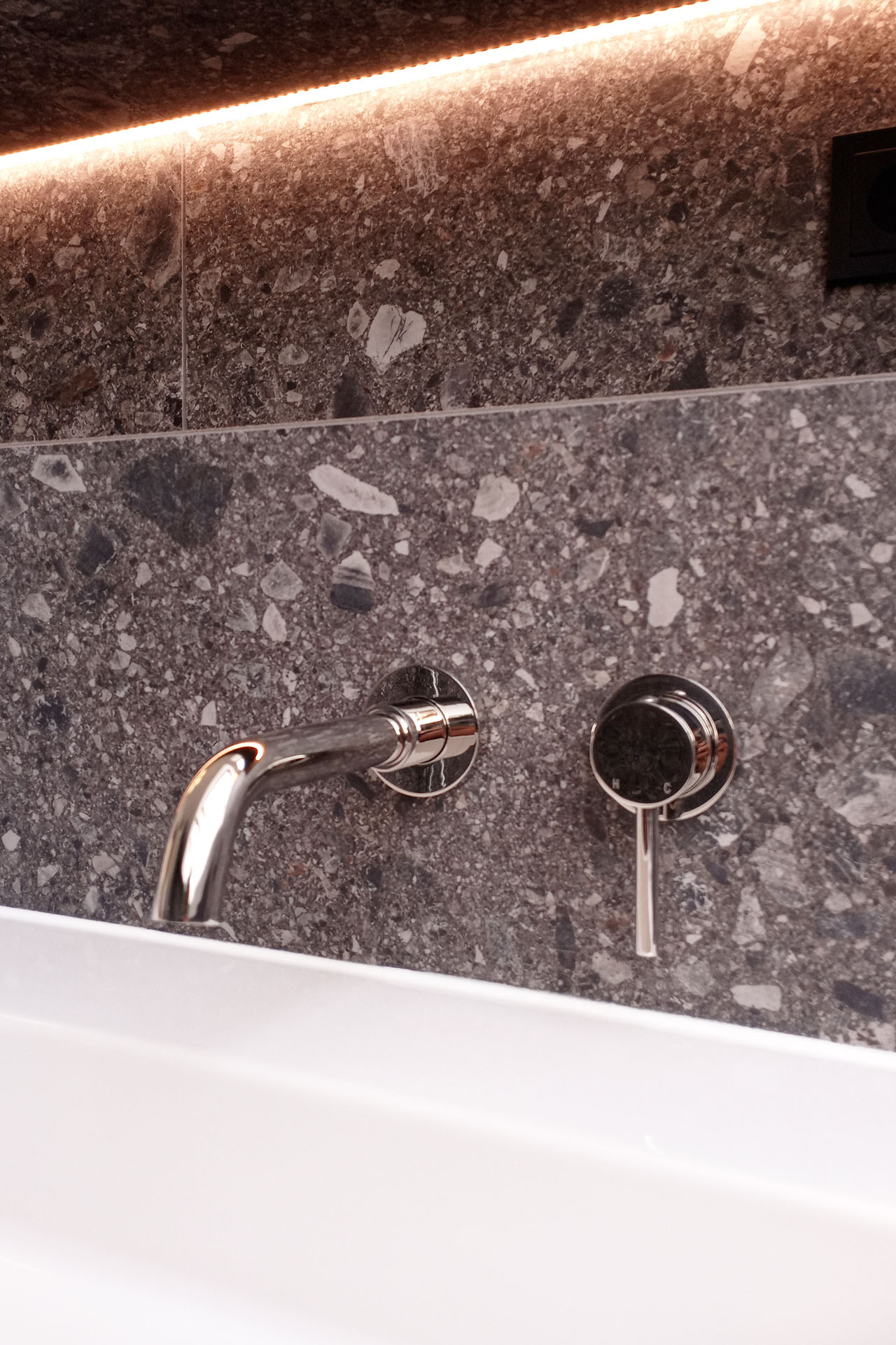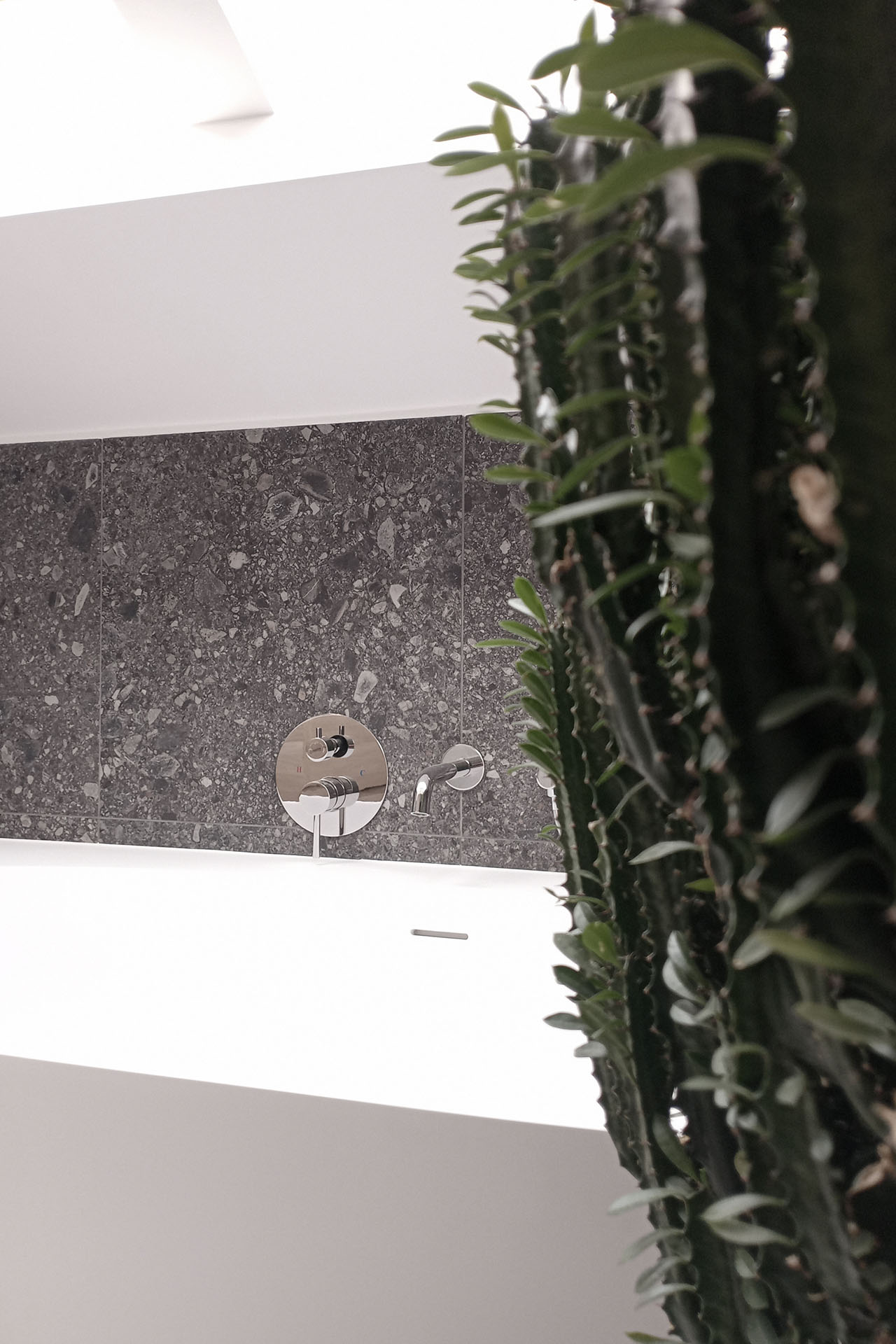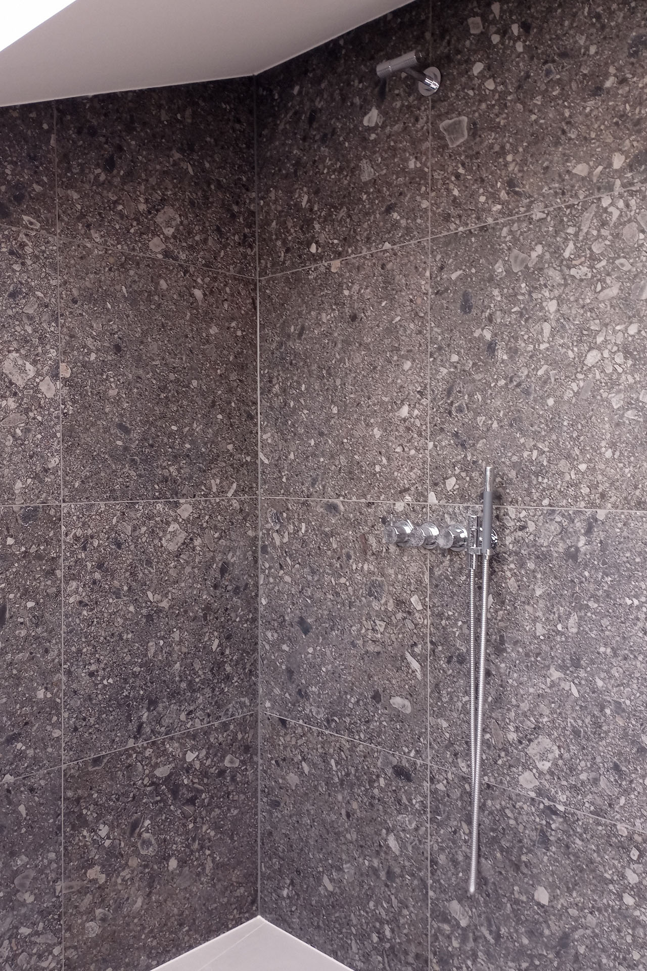 Attic bathroom with a soft, bright atmosphere and darker accents for a boutique-hotel feel. Concept and detailed planning.